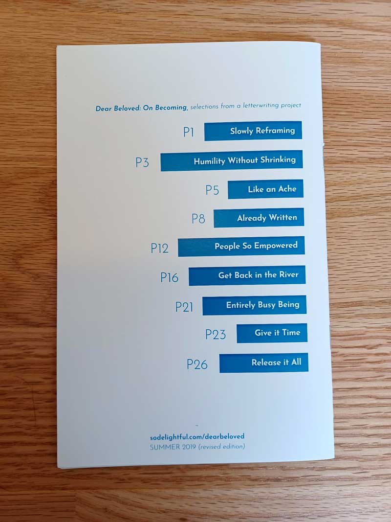 Tender-hearted letters to remind you of what’s important as you become more yourself in this journey called life. Text drawn from the "Dear Beloved" letterwriting project at sodelightful.com/dearbeloved.